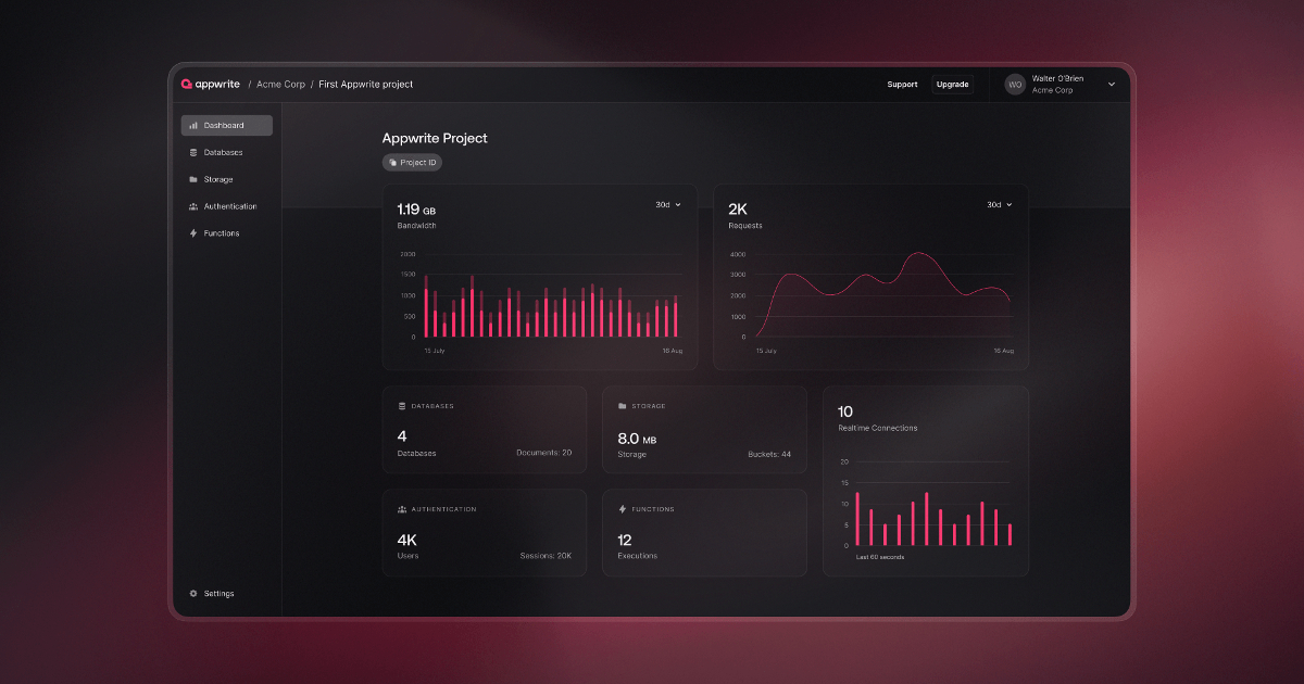 Build your entire backend within minutes and scale effortlessly using Appwrite's open-source platform. Add Authentication, Databases, Functions, Storage, and Messaging to your projects using the frameworks and languages of your choice.